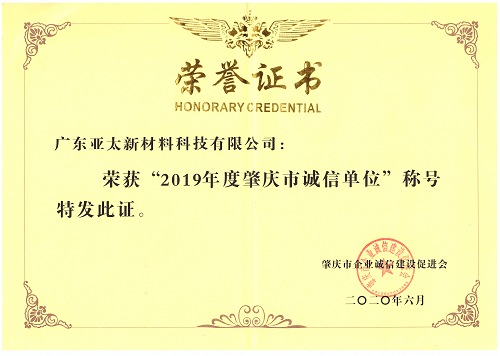 诚信之誉,立足之基 广东亚太公司荣获“2019年度肇庆市诚信单位”称号阅读次数:1093 | 发布日期:2020/6/19 | 作者: | 来源: