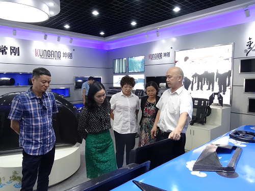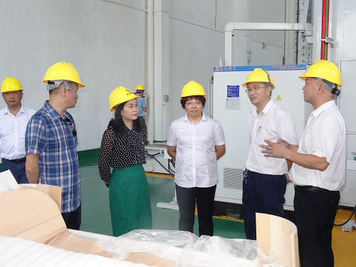 图:翟秀凤副总(中间)陪同汤家欢副市长(左二)、彭明局长(左一)在复材车间参观。