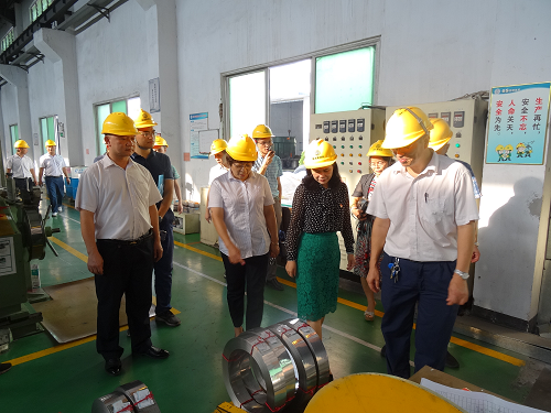 图:翟秀凤副总(左一)陪同汤家欢副市长(左二)在汽车雨刮车间参观。
